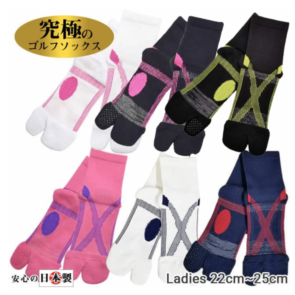 足袋タイプで足先が分かれており、外反母趾対策や指の力を込めやすい形状でグリップ力がアップします。アーチ部分をサポートし、着圧によって血流のポンプ機能をサポートするから長いラウンド中でも足が疲れにくく快適に過ごせます。親指の底面に滑り止めが施してあるのでスイングに安定感が出ます。