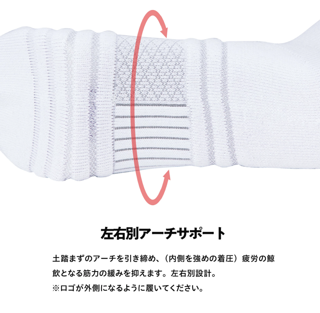 抗菌防臭効果のある素材を使用し、部分的にメッシュを配置するなど長時間のプレーでも快適に靴の中を保つ機能性に優れたゴルフソックス。きつすぎない着圧で足のむくみを抑え、アーチ部分のサポートで疲れにくくなります。左右別設計で足の形に沿う形状にこだわった靴下です。