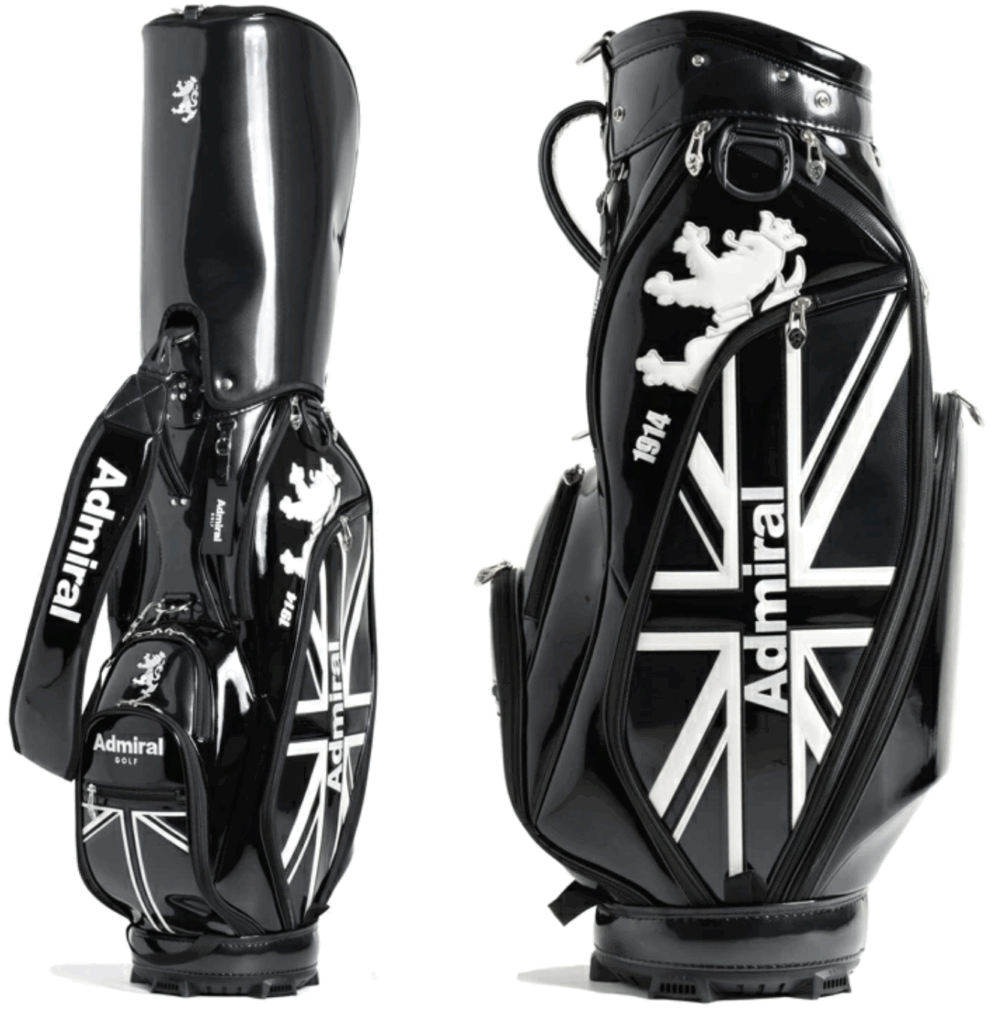 存在感抜群のアドミラルゴルフのキャディバッグ。左右非対称デザインにはユニオンジャックxランパントの人気デザインの組み合わせと、ユニオンジャックにシンプルなパイピングで装飾が施されています。最新モデルや次期モデルでも採用されているカーボンエナメルを使用しており、高級感のあるデザインが目を惹きます。