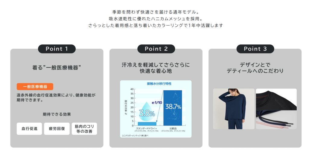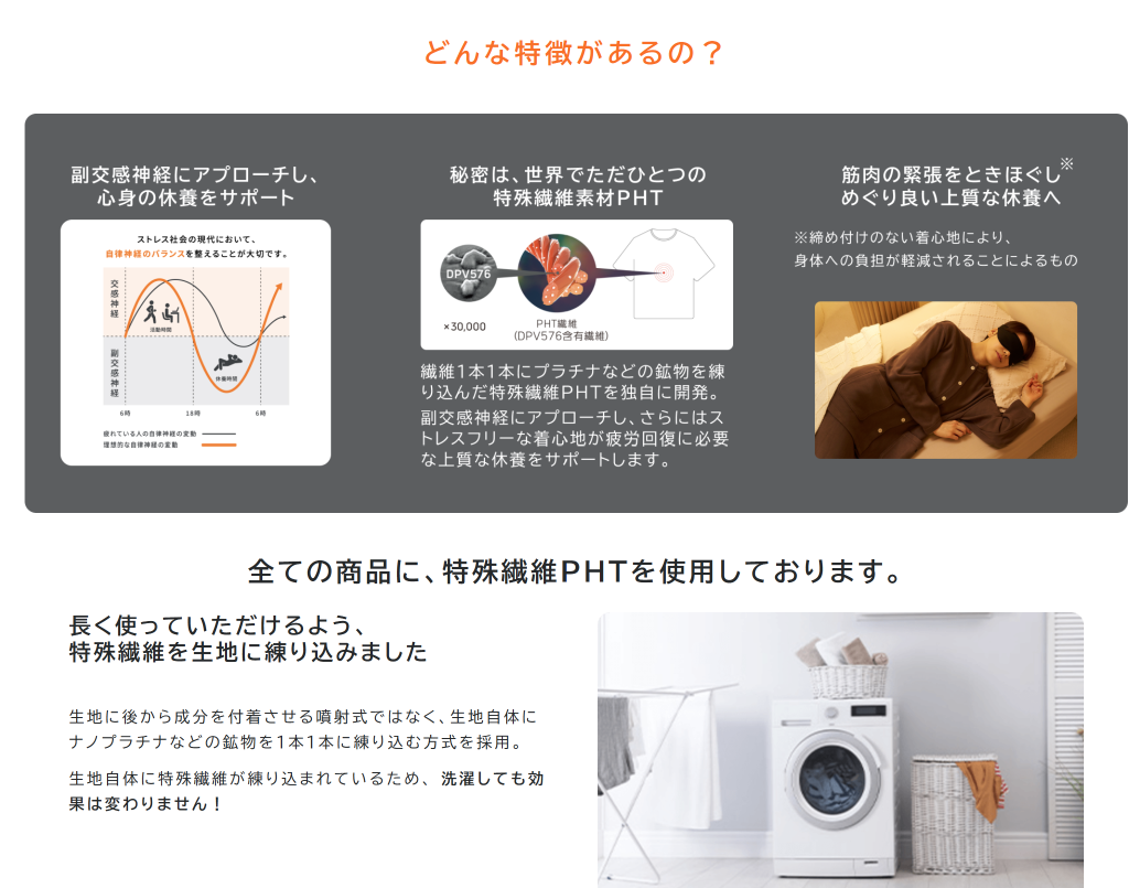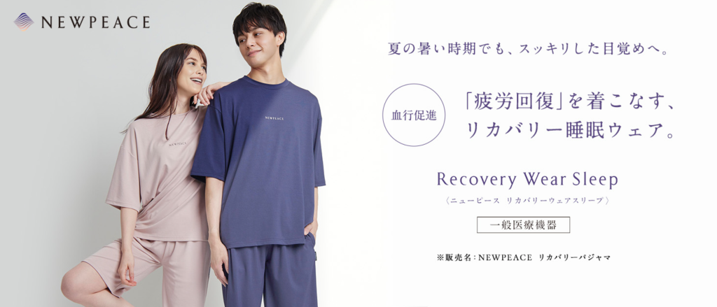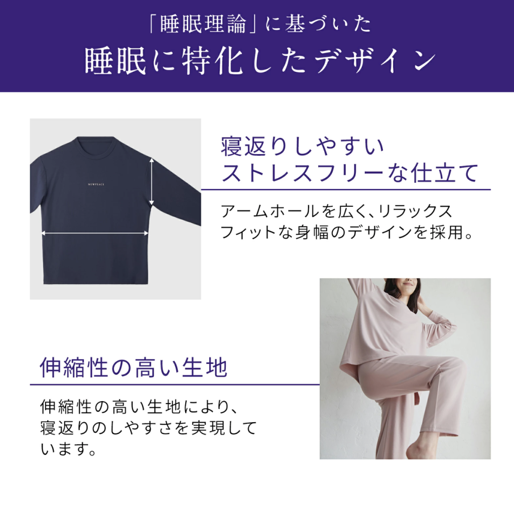天然鉱石を原料とした高純度セラミックを繊維に練り込んだ特殊繊維のメディキュレーションを使用し、シルクのような肌触りでさらっとした着心地を実現しているニューピースのリカバリーウエア。ムレ感や寝汗の不快感を防いでべたつかずにリラックスした状態で睡眠・起床をサポートします。