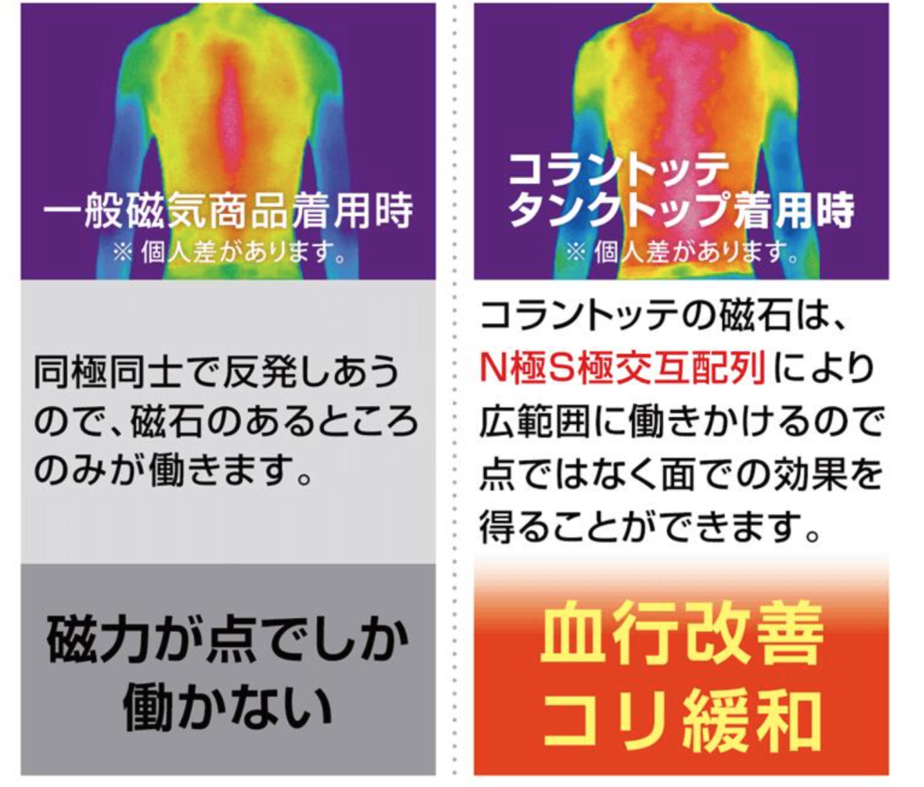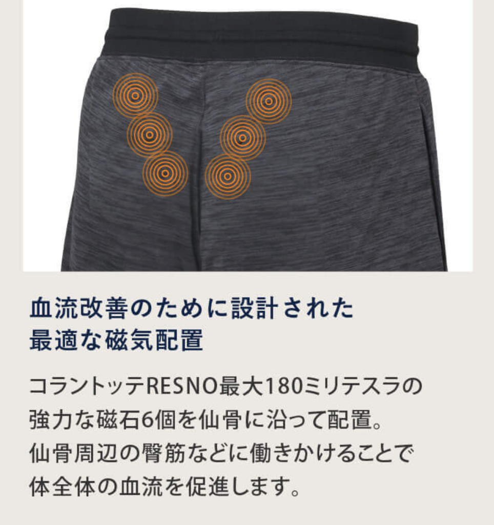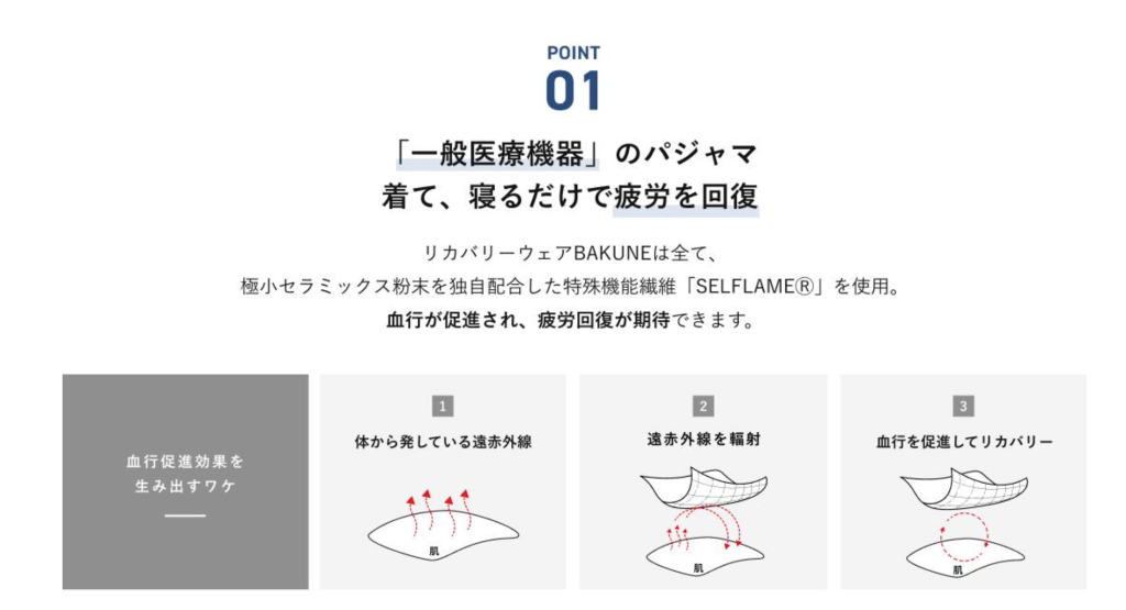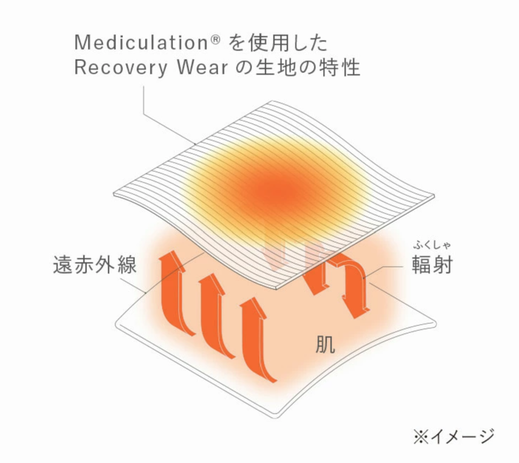 鉱物などを織り込んだ特殊繊維が身体から発生する遠赤外線を輻射して血行を促進します。血行を促進し、筋肉の疲労回復をサポートします。メーカーによってはむくみや冷えの改善などを謳っている場合があります。