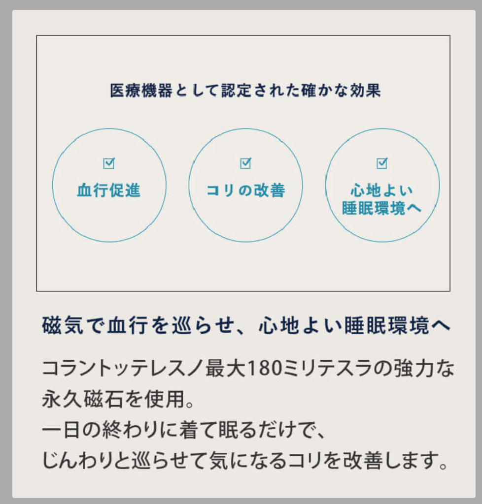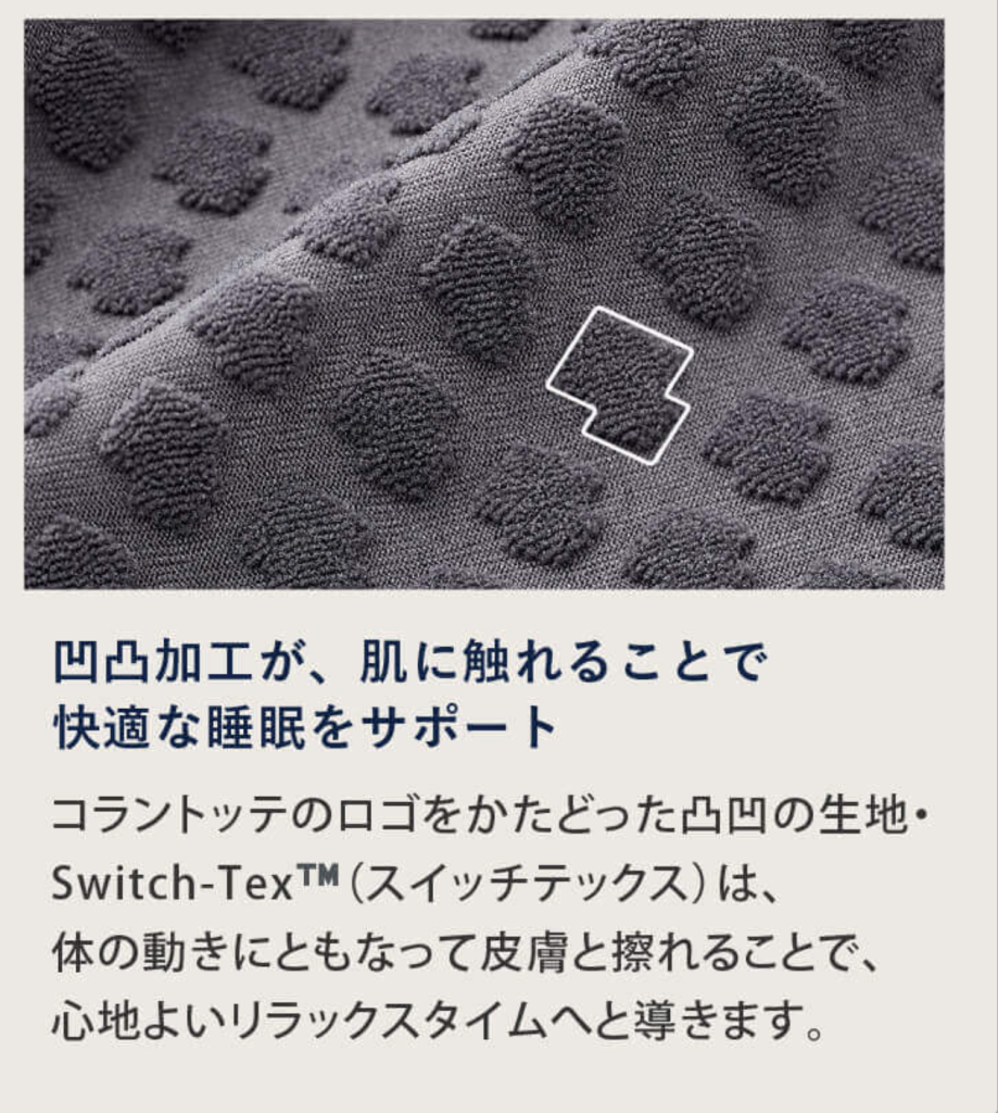 磁器ネックレスが有名なコラントッテ。磁器の力で血行を促進して筋肉の疲労回復をサポートするリカバリーウエアです。磁器の配置や素材にこだわり、快適な寝心地と広範囲に血行改善効果が期待できます。寝返りのしやすさを考えた伸縮性のある素材で眠りを妨げません。