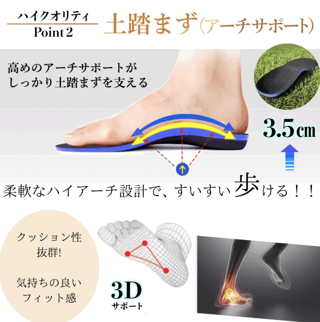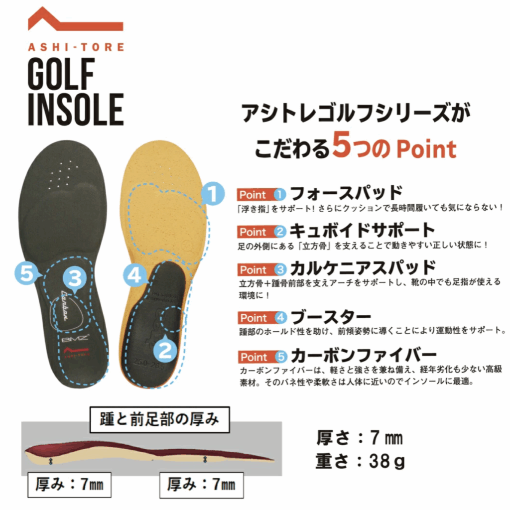 また、土踏まずのアーチをサポートすることで歩行や姿勢を補助し、ラウンド中の疲労や負担の軽減にもつながりますので、パフォーマンスの向上が期待できますよ。