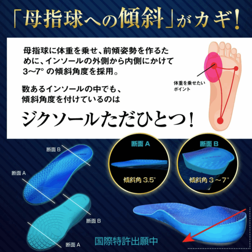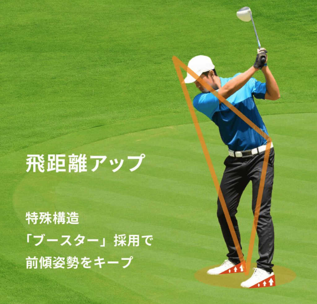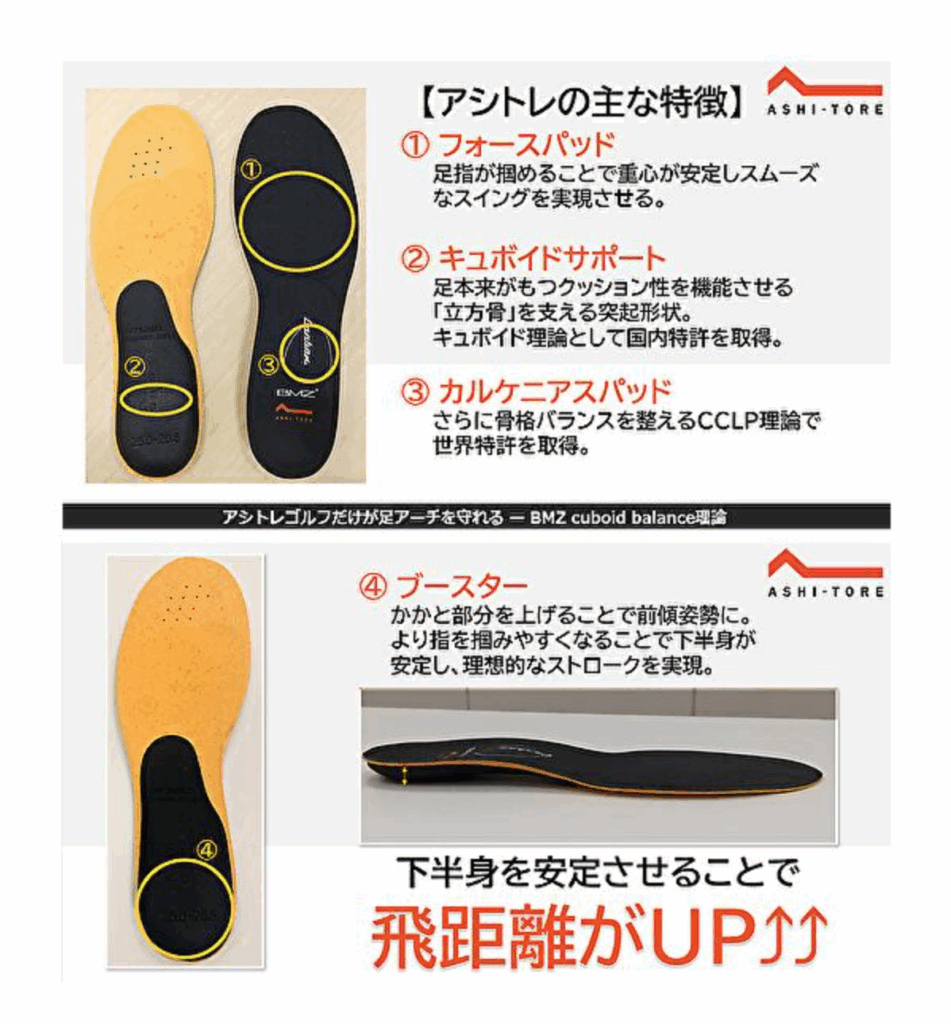 浮き指をサポートするフォースパッドや、足の外側にある立方骨を支えることで動きやすい状態に保つきゅぼいどサポートなど足の骨格に合わせた形状でスイングしやすく支えます。カカト部分を上げることで前傾姿勢が取りやすく飛距離アップが期待できる形状です。
